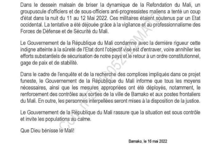 Déjà sous embargo, le Mali a failli de nouveau basculer. En effet, une tentative de coup d’état a été déjouée, annonce, dans le communiqué ci-dessous, le Premier ministre. Selon ce dernier, un pays de la sous-region serait impliqué dans le putsch manqué.