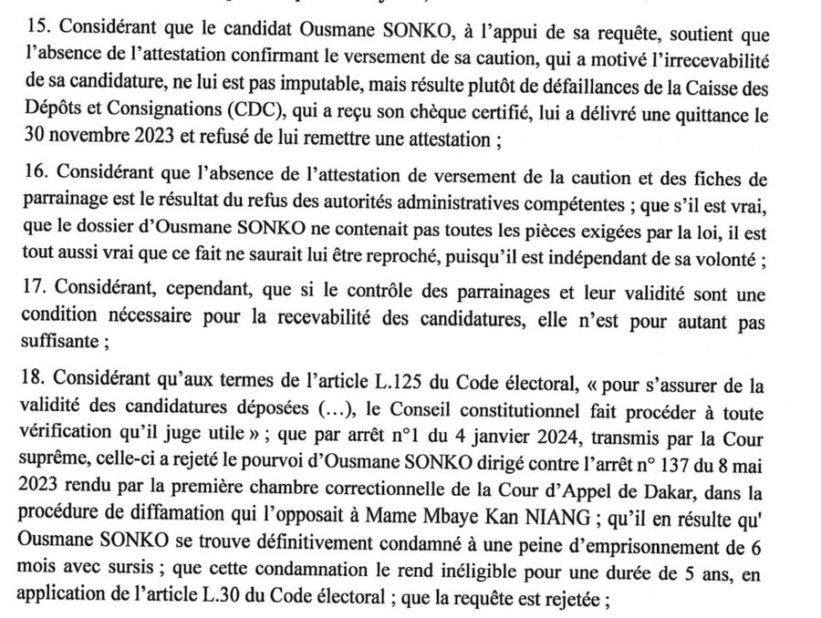 Ils seront 20 sur la ligne de départ pour la prochaine présidentielle. Le Conseil constitutionnel a publié ce samedi la liste des candidats autorisés à briguer le suffrage des Sénégalais le 25 février prochain. Le premier recalé pour défaut d’attestation, le second visé par un recours déposé par Thierno Alassane SALL, Ousmane SONKO et Karim WADE ne figurent pas sur la liste. Les «7 sages » du Conseil constitutionnel ont déclaré leur candidature irrecevable pour les motifs suivants :